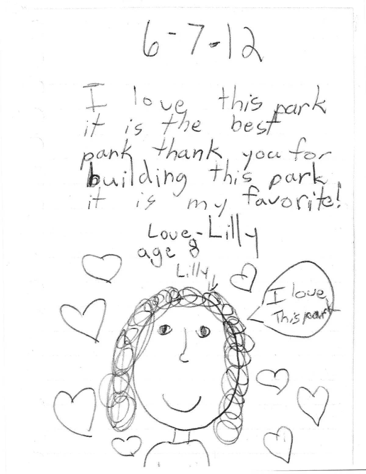 “I have known this park since I was a little girl. Now I am 9 sitting here writing in this book. I love this park.”